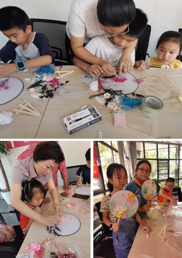 活動(dòng)中還設(shè)置了制作手工團(tuán)扇的環(huán)節(jié),工作人員向孩子們分發(fā)事先準(zhǔn)備好的手工團(tuán)扇材料,在細(xì)致的講解后,引導(dǎo)青少年充分發(fā)揮想象力,運(yùn)用粘、貼、剪、穿等多種藝術(shù)創(chuàng)作形式,將普普通通的干花變成了典雅、美麗的手工作品。