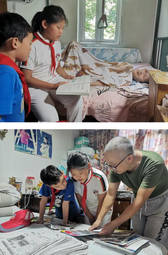 一同參與志愿活動(dòng)的少先隊(duì)員們來(lái)到殘疾老人家中,為常年癱瘓?jiān)诖驳睦夏棠陶b讀書(shū)籍,分享感悟,鼓勵(lì)老奶奶樹(shù)立積極樂(lè)觀的生活態(tài)度。同時(shí)也向長(zhǎng)期照顧老母親和殘疾哥哥的張叔叔討論交流,學(xué)習(xí)張叔叔孝順老人、關(guān)愛(ài)家人的美好品德。