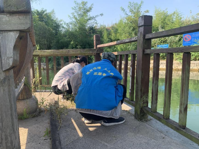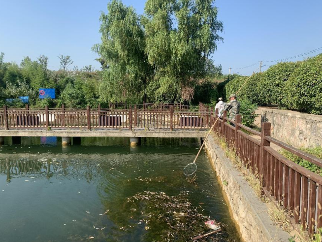 志愿者們頂著將近40度的高溫拿著竹竿、耙子、自制長竿鐮刀等工具對周邊雜物進(jìn)行拔除清理?;顒又校蠹腋视诟冻?、不懼高溫,勞動積極性非常高,經(jīng)過3個小時的垃圾撿拾、雜草清理和浮萍打撈工作,使水面、道路變得干凈整潔、煥然一新。