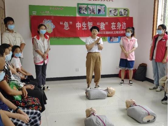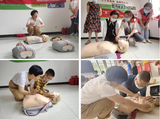 培訓活動中,張霞老師采用理論加實操的授課方式,重點講解了自動體外除顫器的使用要求、使用方法,以及心肺復蘇等相關(guān)急救技能,并現(xiàn)場實操演示,對參與模擬實操的居民一對一進行了部位、姿勢、手部等方面的指導。