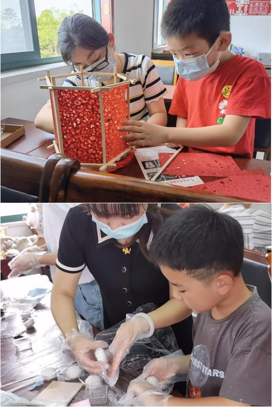 隨后,志愿者將準備好的材料分發(fā)給親子們,引導大家動起手來,手工制作燈籠和月餅。戴上手套,和餡料、做餅皮、包好壓模……一個個寓意團團圓圓的月餅逐漸成形。隨后,親子們在志愿者的指導下搭支架、糊燈籠紙、裝好手柄和流蘇……在一翻巧手擺弄間,一個個個紅彤彤的燈籠就制作完成,親子們的臉上也都浮現(xiàn)出笑容。