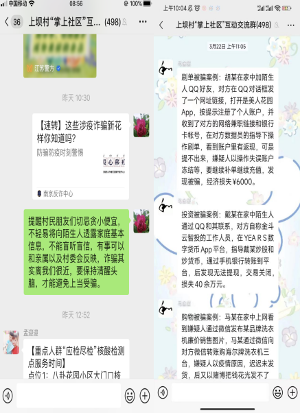 與此同時,上壩村還通過掌上云社區(qū)、微信群等云端平臺,以網(wǎng)絡(luò)直播等形式開展“反詐空中課堂”,提高轄區(qū)群眾的安全防范意識和反詐防騙自我保護意識和能力,全面強化預(yù)警防范,全力構(gòu)筑“全民反詐”防線。目前,“反詐空中課堂”已經(jīng)開展兩期,分別以“中老年反詐防范”“青少年網(wǎng)絡(luò)防騙”為主題,通過圖文并茂的形式,將詐騙的常見類型、報警流程和預(yù)防措施等幾個方面向村民們進行了在線科普,指出案例中受害者受騙上當(dāng)原因,使轄區(qū)群眾了解常見的詐騙方式,熟悉新型的詐騙形式,深刻地認識到防范電信詐騙的重要性。