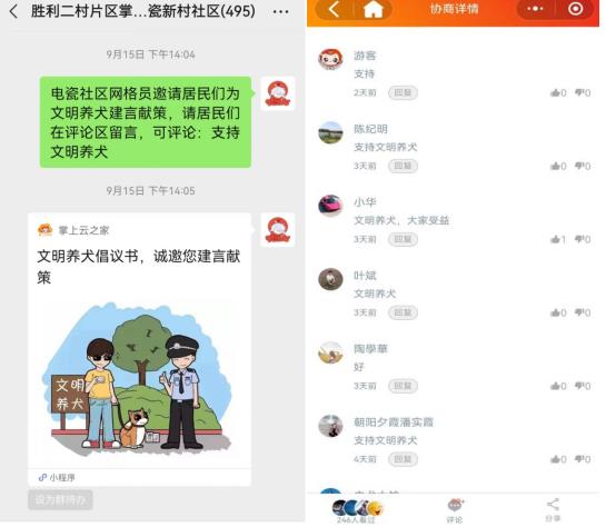 驚擾路人、約束不嚴(yán)、隨意大小便等等不文明養(yǎng)狗行為,不僅困擾著居民的日常生活,還嚴(yán)重影響了社區(qū)日常治理。不少居民還通過“掌上云社區(qū)”向社區(qū)反映不文明養(yǎng)狗行為,希望社區(qū)能夠積極進行引導(dǎo),營造良好生活環(huán)境。倡議一經(jīng)發(fā)出,得到了社區(qū)居民的一致點贊與支持,“支持!不文明養(yǎng)狗行為就應(yīng)該消除!”“非常支持!這不僅是對狗狗負(fù)責(zé),還是對小區(qū)居民負(fù)責(zé)!”
