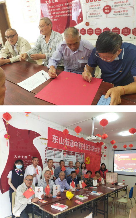 “福”字是福氣、福運(yùn)的象征,寫福字,寄托了人們對(duì)幸福生活的向往,對(duì)美好未來(lái)的祝愿。活動(dòng)的開(kāi)始是社區(qū)志愿者寫“百福圖”,老人們不同筆體寫出了不同風(fēng)格的福字,每個(gè)“福”字都體現(xiàn)著對(duì)祖國(guó)生日的祝愿與國(guó)家美好昌盛的喜悅。接下來(lái),江蘇銀行詩(shī)朗誦《永遠(yuǎn)跟黨走》,黨員代表也演唱了《沒(méi)有共產(chǎn)黨就沒(méi)有新中國(guó)》、《南泥灣》、《珊瑚頌》等,唱出了所有人對(duì)美好生活的幸福感、滿足感,和愛(ài)黨愛(ài)國(guó)堅(jiān)定不移的信念。最后活動(dòng)在《唱支山歌給黨聽(tīng)》中結(jié)束。