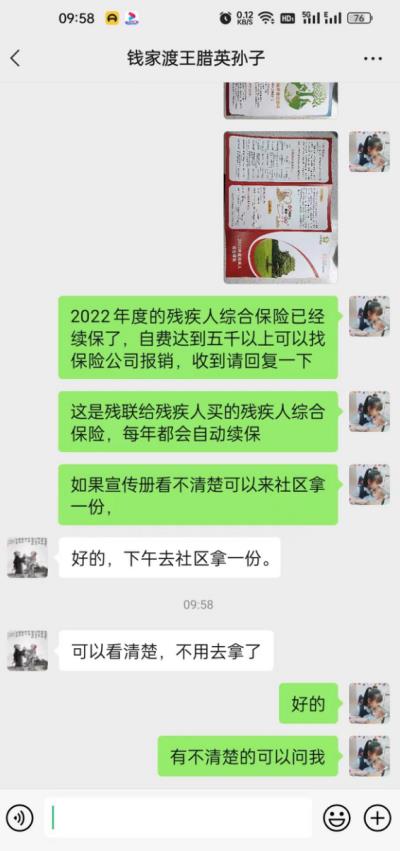 和平村網(wǎng)格員通過(guò)線下見(jiàn)面以及線上微信交流的方式,對(duì)殘疾人綜合保險(xiǎn)政策進(jìn)行宣傳講解。從保險(xiǎn)保障責(zé)任、保障范圍、賠償標(biāo)準(zhǔn)、理賠程序、報(bào)案途徑及殘疾人綠色理賠通道等方面進(jìn)行了介紹。為確保宣傳取得實(shí)效,網(wǎng)格員還發(fā)放了《殘疾人意外傷害保險(xiǎn)宣傳手冊(cè)》,并在介紹政策的過(guò)程中及時(shí)解答殘疾人的疑惑。