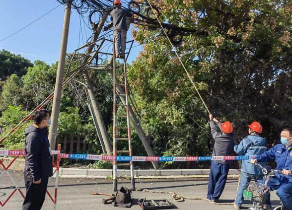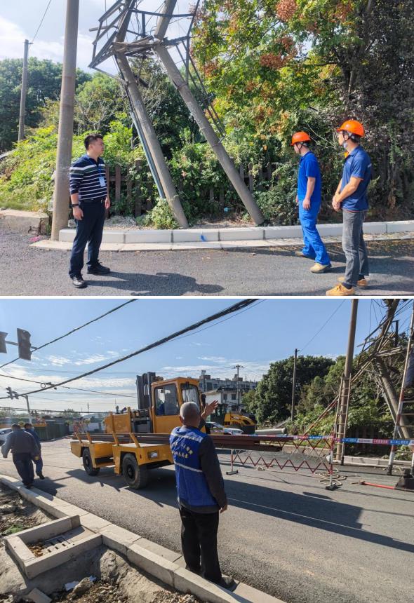 為保障來往行人車輛安全,棲霞街道新合村立即聯(lián)系了電線桿產(chǎn)權(quán)單位南京電信公司查看現(xiàn)場,城治委公眾委員要求其盡快把撞斷的電線桿拖走消險處理。經(jīng)過與電信公司現(xiàn)場勘查和溝通,10月11日上午,南京電信公司安排施工單位對這兩根電線桿消險處理?,F(xiàn)場,城治委公眾委員和城市治理志愿者幫忙一起拉警戒線,維持交通秩序。經(jīng)過一上午的處理,電線桿拖走消險,線纜重新整理好。