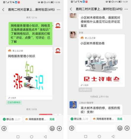 社區(qū)充分發(fā)揮網(wǎng)絡(luò)線上平臺(tái)的宣傳引導(dǎo)作用,在電子顯示屏、網(wǎng)格員在網(wǎng)格居民微信群持續(xù)推送政府部門(mén)相關(guān)惠民政策及法律法規(guī)等知識(shí),提高廣大居民群眾對(duì)社會(huì)化管理的知曉率及參與度。居民也可以通過(guò)微信群隨時(shí)反映其建議與想法,使社區(qū)治理更深入人心。
