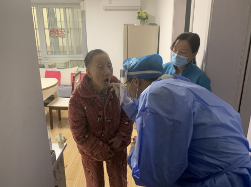 導(dǎo)老人核酸采集,醫(yī)護(hù)人員一邊迅速地進(jìn)行采樣。不少老年人由于腿腳不便或臥病在床,身體不適,醫(yī)護(hù)人員就不斷地調(diào)整姿勢(shì)進(jìn)行采樣。每次采樣都要彎腰探身,或者單膝跪地,找準(zhǔn)角度。在盡量減少老年人不適感的同時(shí),保質(zhì)保量完成核酸采樣工作,志愿者們及醫(yī)護(hù)人員對(duì)老年人群體的細(xì)心、用心、貼心,得到了轄區(qū)居民的一致好評(píng)和認(rèn)可。