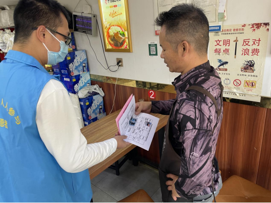 行動(dòng)中,志愿者們來(lái)到花港路沿街門面房,逐戶走入每家商戶,檢查防疫、油煙凈化器清洗情況,提醒商戶佩戴口罩。對(duì)防疫措施不完善的商戶要求現(xiàn)場(chǎng)整改,并提醒商戶及時(shí)清洗油煙凈化器并保存好相關(guān)票據(jù),督促?zèng)]有辦理污水排放許可證的商戶及時(shí)辦理,對(duì)沒(méi)有領(lǐng)取門前三包責(zé)任書的商戶提醒其來(lái)社區(qū)領(lǐng)取。