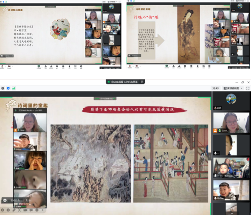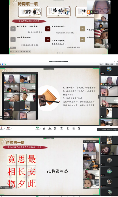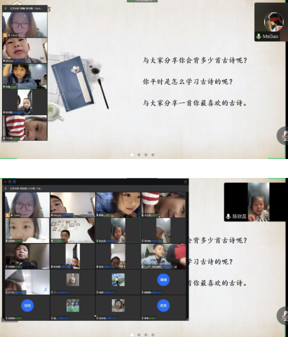 “我從小就背誦《唐詩(shī)三百首》。”“在學(xué)校有老師教,在家里爸爸媽媽會(huì)抽背。”社工首先開(kāi)啟了“古詩(shī)詞大調(diào)查”環(huán)節(jié),孩子們依次分享自己大約會(huì)多少首古詩(shī)詞,平時(shí)如何學(xué)習(xí)古詩(shī)詞,并背誦出自己最拿手最喜歡的一首古詩(shī)詞,大家爭(zhēng)先恐后地展現(xiàn)自己的本事,線上活動(dòng)的氛圍瞬間被帶動(dòng)了起來(lái)。
