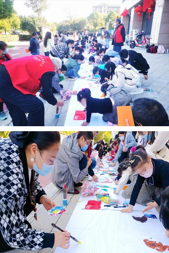 緊接著,社區(qū)青少年及家庭成員攜手老黨員共同繪制了百米長卷《我和我的祖國》。在家長和老黨員的指導下,社區(qū)青少年滿懷激情地描繪著自己心中對祖國的熱愛,創(chuàng)造出了一幅幅色彩斑斕、靈動活潑的畫卷,為美麗中國獻上真摯的祝福。最后,社區(qū)青少年及家庭攜手老黨員與《我和我的祖國》百米畫卷進行合影留念。