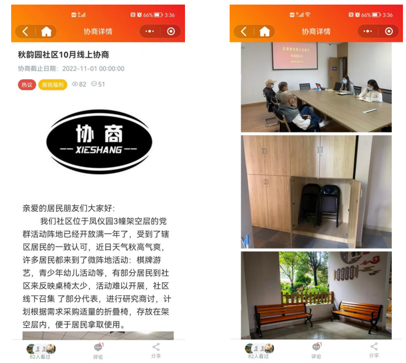 秋韻園社區(qū)“紅韻”黨群服務(wù)微陣地自開放以來,受到了轄區(qū)居民的一致認可,近日天氣秋高氣爽,許多居民都來到了微陣地進行棋牌游藝、青少年手工等活動,有部分居民反映活動陣地桌椅太少,活動難以展開,社區(qū)“紅韻小管家”在掌上云“線上協(xié)商”模塊發(fā)布議事,針對架空層桌椅的樣式和數(shù)量進行討論,同時在線下召集了部分居民代表,進行同步研究商討,社區(qū)根據(jù)線上線下共同協(xié)商的情況,最終確定了微陣地的桌椅采購款式和數(shù)量。