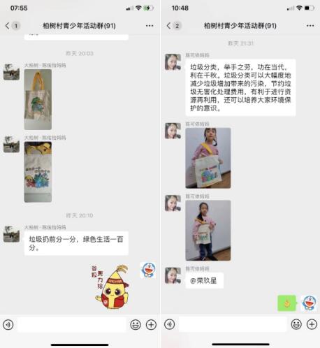 活動(dòng)開始,工作人員在群里向大家深入講解了垃圾對地球的危害、垃圾分類的必要性以及在日常生活中如何做好垃圾分類,并通過問答互動(dòng)的方式舉例生活中常見的垃圾是屬于哪類垃圾。青少年在群里及時(shí)回復(fù),積極互動(dòng),提升線上活動(dòng)氛圍。在家長們的指導(dǎo)下,青少年還手繪了垃圾分類帆布袋,通過顏色的運(yùn)用提升對分類垃圾箱的認(rèn)識(shí),色彩分明的宣傳標(biāo)語也將垃圾分類的理念貫穿于整場活動(dòng)之中。