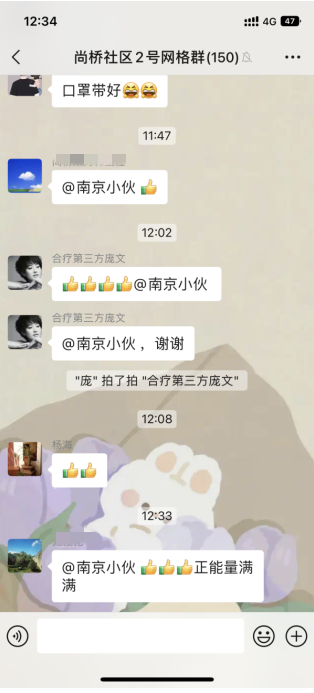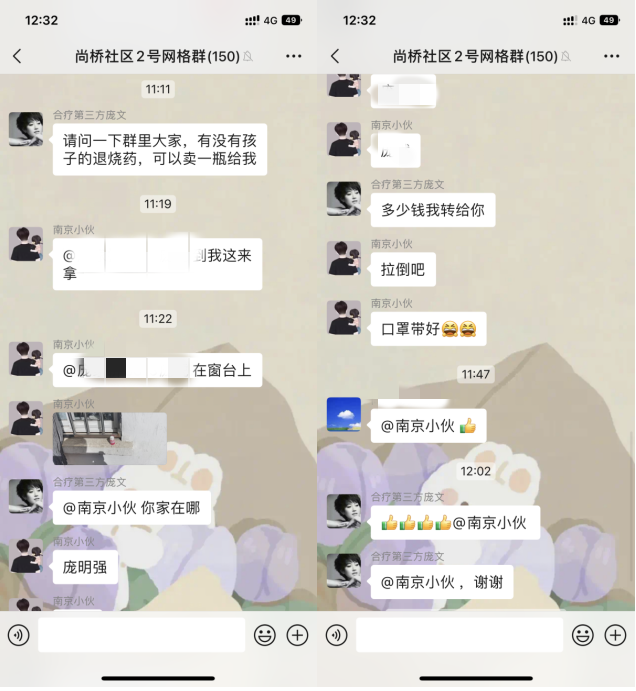 12月18日中午,家住尚橋社區(qū)2號(hào)網(wǎng)格的龐女士孩子高燒不退,家里也沒有退燒藥,無(wú)奈在網(wǎng)格群里發(fā)布求藥信息,群內(nèi)一位網(wǎng)名叫“南京小伙”的村民立馬回復(fù)到我這來(lái)拿,并細(xì)心的將藥品放至窗臺(tái)上,便于龐女士取藥。短短不到半個(gè)小時(shí),龐女士便取到藥回到家中。鄰居溫暖的舉動(dòng),讓龐女士感動(dòng)不已,群內(nèi)其他村民也紛紛為“南京小伙”點(diǎn)贊。