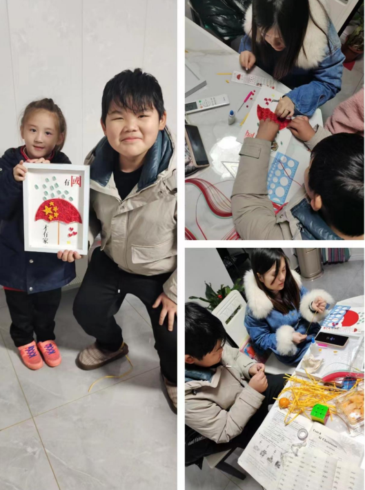 因?yàn)檠芗埵止さ闹谱鬟^程相對(duì)復(fù)雜,需要家長(zhǎng)的介入幫助,在制作視頻的教學(xué)下,家長(zhǎng)和孩子分工明確,標(biāo)記、卷紙、粘貼,在相互溝通協(xié)作中商量著手工制作的每一個(gè)步驟,在每一步完成的喜悅中享受美好的親子時(shí)光。“中國(guó)夢(mèng)”、“愛我中華”、“有國(guó)才有家”,每一幅作品都表達(dá)出孩子們熱愛祖國(guó)的心聲。隨后,孩子們又用文字來直抒胸臆,“家是最小的國(guó),國(guó)是千萬(wàn)家。”“心中有夢(mèng)想,腳下就有力量。”“紅色是跳動(dòng)的火焰,黃色則充滿了期望。”字里行間流露出對(duì)祖國(guó)的無(wú)限之愛,自豪感和責(zé)任感油然而生。