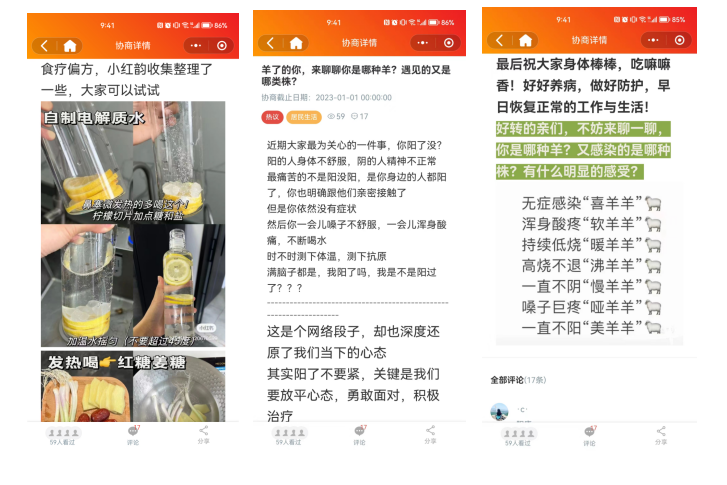 居民在線上聊一聊“你陽了嗎?”、看一看“如何食療減輕癥狀”,為居民提供了線上心理舒壓的平臺(tái),大家紛紛在留言區(qū)暢所欲言,說說自己的癥狀、討論下如何用藥。有人家中缺藥了,還有愛心居民自告奮勇:“我家有,給你用,不要錢!”各種暖心舉動(dòng)不勝枚舉。居民趙女士表示:特殊時(shí)期的線上溝通很有必要,能讓大家暢所欲言、排解壓力,也使得社區(qū)服務(wù)更加貼心。