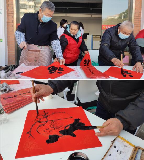 活動現(xiàn)場,書法家們擺開書案、鋪開紅紙、執(zhí)筆蘸墨、盡情揮毫,在吉祥喜慶的大紅紙上寫下他們對新年的美好祝福,一個個“福”字、一副副春聯(lián)生動地呈現(xiàn)在大家眼前,淡淡的書墨香氣,濃濃的新春氛圍撲面而來。現(xiàn)場的居民們手捧紅紅火火的春聯(lián)和福字,喜悅之情溢于言表。