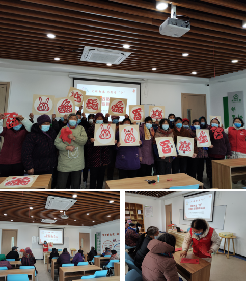 活動(dòng)尾聲,老人們小心翼翼地把精美的窗花兔子貼在了裁剪整齊的廢紙板,大家相互展示自己的成品。李阿姨的兔子窗花獲得了周圍老人的稱贊,紅艷艷的剪紙窗花營(yíng)造出濃濃的年味。