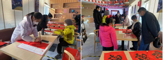 活動現(xiàn)場,墨香飄溢,氣氛熱烈。小朋友們在書法老師的教導(dǎo)下,一筆一畫認(rèn)真臨摹春聯(lián)與福字,體驗春節(jié)傳統(tǒng)年俗的獨特韻味。書法愛好者同樣揮毫潑墨,傾情書寫,一副副寓意吉祥的春聯(lián),一張張喜氣洋洋的“福”字,化作最真摯的新春祝福,讓大家提前感受到了濃濃的年味兒,感受春聯(lián)之美,共迎兔年新春佳節(jié)!現(xiàn)場居民高興地說:“盡管現(xiàn)在市場上隨處都能買到春聯(lián),但還是自己創(chuàng)作的春聯(lián)更有喜氣、更有煙火氣,春節(jié)還沒到,已經(jīng)感受到了濃濃的年味兒了!”