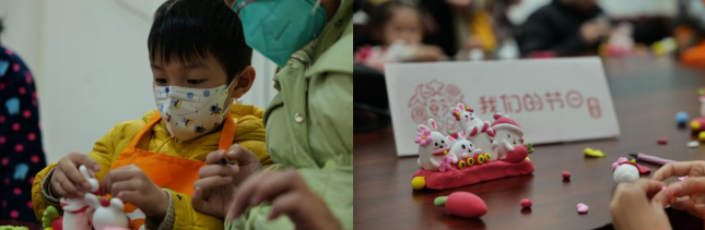 最令孩子們期待的莫過于制作兔子面塑了,活動開始前,社工老師首先向孩子們介紹了面塑的歷史淵源與發(fā)展,并向孩子們展示各式各樣面塑的藝術(shù)圖片,伴隨著陣陣“哇”的驚嘆聲,孩子們躍躍欲試。隨后老師現(xiàn)場進(jìn)行面塑教學(xué),配合著實(shí)際操作,對制作面塑時不同的手法,如捏、搓、揉、刻、劃等詳細(xì)進(jìn)行介紹,并將提前準(zhǔn)備好的制作材料分發(fā)給參與活動的每個小朋友。通過通過揉、搓、捏、切、刻、劃不同手法,每個孩子都塑造出了屬于自己的“小兔子”。孩子們的成就感也立馬拉滿。