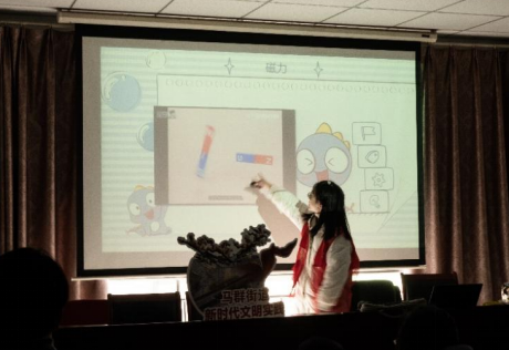 寒潮襲空,九九將逝。穿越寒風(fēng),跨越長(zhǎng)路,南師大物科院“向心力”志協(xié)的大學(xué)生志愿者領(lǐng)隊(duì)馬芷涵同學(xué)受邀擔(dān)任本次活動(dòng)的講師,帶領(lǐng)著物理科學(xué)與技術(shù)學(xué)院2102H班級(jí)的志愿者們,為棲霞區(qū)馬群街道果場(chǎng)社區(qū)新時(shí)代文明實(shí)踐站的未成年人們?nèi)计鹆丝茖W(xué)的篝火。