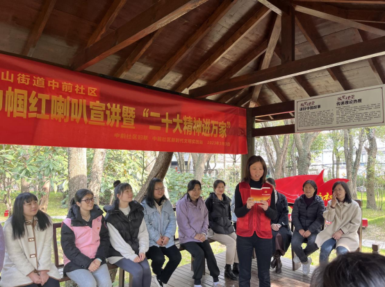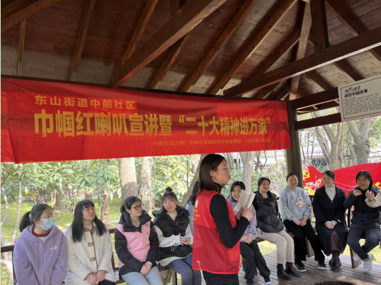 為學習好、宣傳好、貫徹好黨的二十大精神,引領(lǐng)服務(wù)群眾爭當黨的二十大精神的“宣傳員”,激勵廣大婦女聽黨話、跟黨走,推動黨的二十大精神落地生根、在婦女群眾中結(jié)出碩果。3月3日,南京市江寧區(qū)東山街道中前社區(qū)新時代文明實踐站、中前社區(qū)婦聯(lián)在香樟園初心亭開展巾幗紅喇叭宣進暨“二十大精神進萬家”。