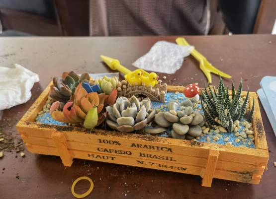 隨后,大家一同開始盆栽制作。“多肉植物的生長需要充足的陽光和適量的水分。”志愿者向在場的青少年們簡單的介紹了盆栽植物的種類、生長習(xí)性和日常養(yǎng)護知識,并現(xiàn)場示范種植多肉植物,鼓勵青少年們根據(jù)自己想法和創(chuàng)意,制作專屬自己的多肉植物盆栽。孩子們熱情高漲,依次挑選喜愛的多肉種類,利用種植工具,將多肉進行安放、填土,體驗動手種植的樂趣。