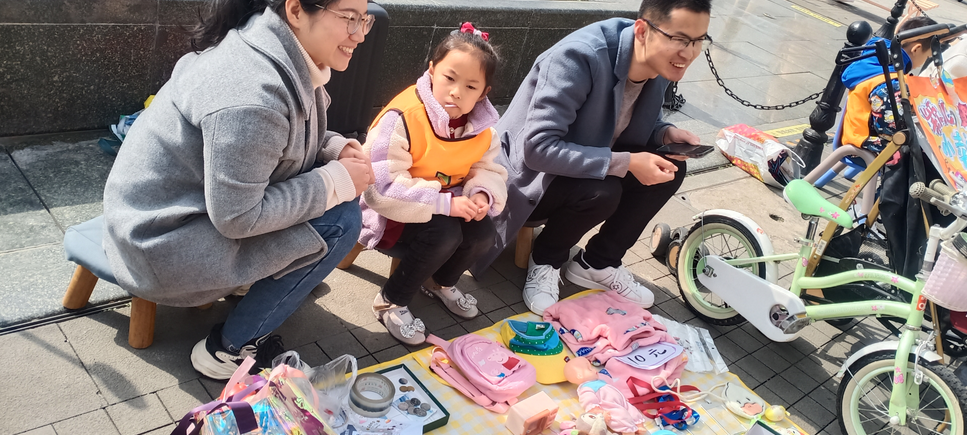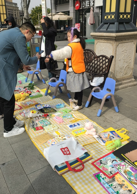 活動現(xiàn)場,孩子和家長們挑選出家中品相較好的閑置玩具、書本、文具、手工DIY等物品,家長們先將物品進行簡單分類定價,制作成價目表給每個物品定好標簽,接著“小老板們”各顯神通,通過手繪或打印的方式,制作出一個個吸引眼球的精致宣傳板,并用彩帶裝飾自己的店鋪,經(jīng)過一上午的宣傳擺攤,每個攤位都收獲滿滿,每一個孩子都充滿了自豪感。