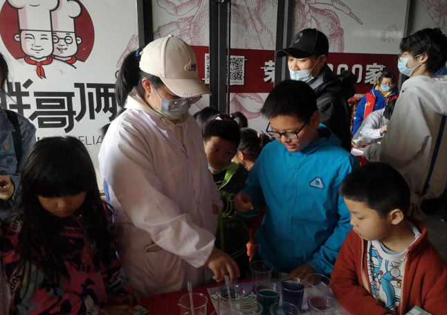 “紫甘藍也能變彩虹”如名所示,用到了酸堿指示劑變色的相關(guān)原理。家常菜中的紫甘藍遇白醋和小蘇打后呈現(xiàn)不同的顏色,絕妙的展現(xiàn)了化學與生活的精彩碰撞,為小朋友帶來不一樣的體驗。講師剛開始向小朋友一一展示了桌子上的化學試劑,說明了什么顏色。紫甘藍原本是紫色,小朋友在講師的指導下,向紫甘藍中分別滴加白醋和小蘇打,發(fā)現(xiàn)兩種溶液的顏色并不相同。小朋友問:“這是為什么呀?”講師向小朋友解釋了其中的原理,小朋友很認真地點了點頭。
