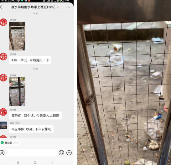 近期,家住南京市棲霞區(qū)馬群街道百水芊城麗水坊4棟一樓的遲先生發(fā)現(xiàn)窗外的平臺上散落著大量生活垃圾,于是通過居民“掌上云”微信群向物業(yè)部門反映,希望能夠得到清理。