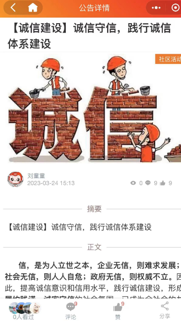 為深入開展誠信文化宣傳教育,進(jìn)一步弘揚(yáng)重信踐諾的傳統(tǒng)美德,3月24日,南京市棲霞區(qū)邁皋橋街道山水園社區(qū)開展線上誠信宣傳活動,依托掌上云社區(qū)平臺,定期發(fā)布誠信宣傳鏈接,引導(dǎo)居民樹立誠實(shí)守信、遵德守禮的意識,讓誠信宣傳走進(jìn)千家萬戶。
