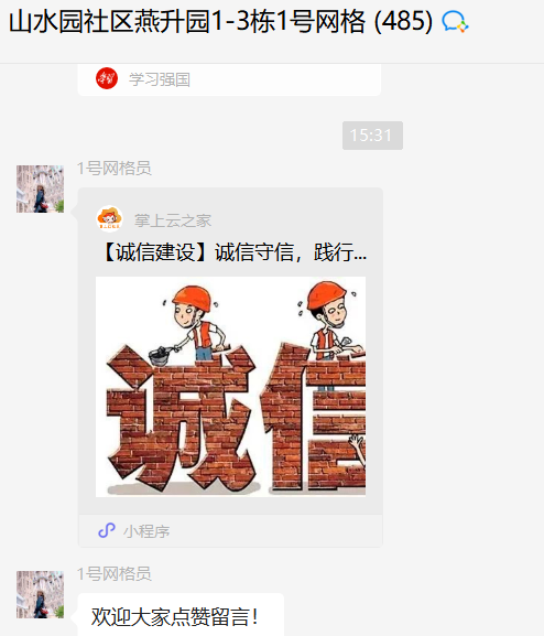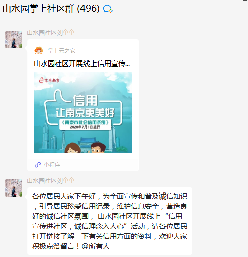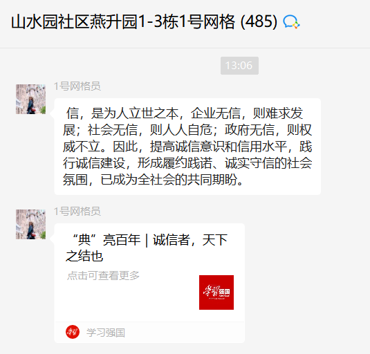 社區(qū)充分利用掌上云社區(qū)微信群覆蓋面廣、傳播速度快的優(yōu)勢,定期在掌上云之家發(fā)布宣傳鏈接,針對居民關(guān)注度較高的個人征信、信息保護(hù)等問題進(jìn)行集中宣傳。網(wǎng)格員定期在群內(nèi)發(fā)布有關(guān)誠信學(xué)習(xí)鏈接,向群內(nèi)居民介紹、講解中華民族傳統(tǒng)美德與社會主義核心價值觀中“誠信”的內(nèi)涵,宣傳誠信在個人道德修養(yǎng)與文明城市中的重要意義,教育引導(dǎo)廣大居民誠實(shí)守信、崇德向善。