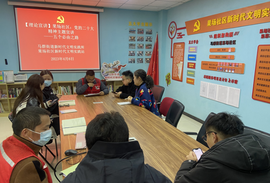 2023年4月6日下午,馬群街道新時代文明實踐所與果場社區(qū)新時代文明實踐站進行站所聯(lián)動,依托理論宣講服務(wù)平臺,在社區(qū)一樓實踐站文化陣地,組織社區(qū)黨員、新業(yè)態(tài)新就業(yè)群體黨員、民兵、退伍軍人、“齊益果”積分制志愿者開展黨的二十大精神宣講。本次宣講人由社區(qū)黨員陶博擔(dān)當(dāng)志愿者,宣講內(nèi)容主要為“五個必由之路”。