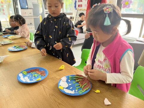 孩子們一拿到材料包就迫不及待地拆開,一個(gè)個(gè)發(fā)揮自己獨(dú)特的想象力,用色彩繽紛的橡皮泥捏成花,捏成云,捏成雨......在畫盤上拼湊出“雨生百谷”的美麗景象。
