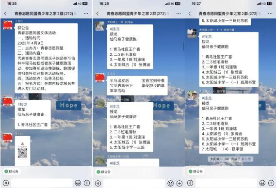 早在2月份,”益踐青心”志愿者就在“掌云”微信群里發(fā)布仙林馬拉松報(bào)名信息。不少社區(qū)家庭在看到信息后紛紛踴躍報(bào)名,由“益踐青心”志愿者登記報(bào)名信息,組建活動臨時微信群,通知仙林馬拉松活動進(jìn)展,告知參與者注意事項(xiàng),為參與的居民提供貼心的服務(wù)。