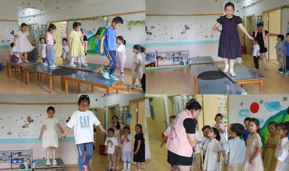 最后,老師將桌子擺成一條,當(dāng)作馬路,然后把卡紙做的模擬井蓋,放在兩個(gè)桌子中間。讓孩子們逐一上前演練“如何避免踩空井蓋”,孩子們學(xué)得不亦樂(lè)乎,互相交流感受,現(xiàn)場(chǎng)充滿了歡快的氣氛。