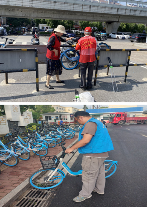 為此,南京市棲霞區(qū)馬群街道百水家園社區(qū)城市治理志愿者,黨員志愿者,退役軍人志愿者們,冒著炎炎夏日將小區(qū)內(nèi)的共享單車搬到共享單車的指定停放處,特別是百水家園小區(qū)南門口,那里雖然有防止送回外賣送餐人員抄近路設置的單項圍欄,共享單車也被一些沒有素質的居民騎進了小區(qū),并隨意停放在南門大門口這里,退役軍人志愿者和黨員志愿協(xié)力將共享單車搬出圍欄,放在外面的非機動車停車位上,經(jīng)過努力小區(qū)的共享單車又一次的被整體的清理干凈,小區(qū)的面貌得到了極大的改觀,而共享單車整齊的排放,成了另一道風景線。
