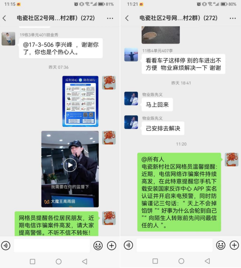“居民朋友們,因?yàn)殡娦旁p騙形式多,變化快,犯罪分子多在境外,且對(duì)心理學(xué)研究透徹,請(qǐng)大家提高警惕,不聽(tīng)不信不轉(zhuǎn)賬,盡快安裝反詐APP……”在居民微信群里,社區(qū)民警、網(wǎng)格員們廣泛宣傳、多次強(qiáng)調(diào)反詐知識(shí),引起居民的警惕和注意。