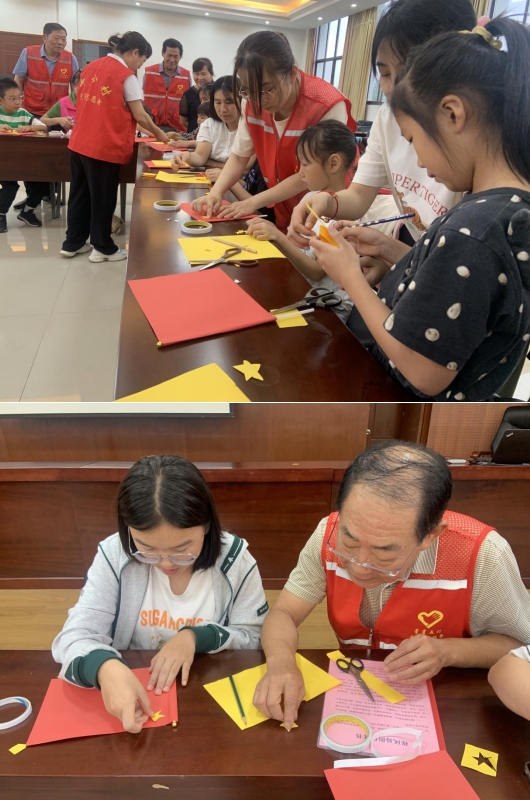 活動伊始,黨員志愿者為未成年人家庭發(fā)放了空白紅旗、貼紙以及旗桿,為他們講述了國旗上五顆星的構(gòu)造和國旗的由來意義,孩子們?nèi)褙炞Ⅰ雎牐砬橹谐錆M著對國旗的敬意。隨后,志愿者介紹了國旗制作的注意事項(xiàng)以及步驟,并手把手示范教授。孩子們對制作國旗都抱有很高的熱情,他們剪剪貼貼,有的還分工合作,忙得不亦樂乎,用卡紙剪出的每一顆星星有棱有角、疏密相間,孩子們還特別專注的將每顆小星的尖角正對代表著中國共產(chǎn)黨的大星中心點(diǎn)。制作完成后,孩子們相互展示自己制作的國旗,臉上洋溢著幸福愉悅的笑容。