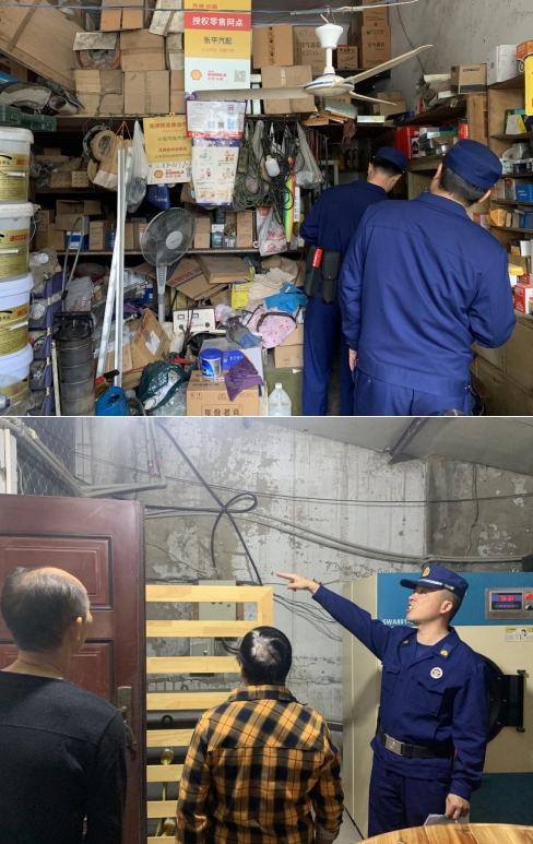 社區(qū)工作人員與特勤隊(duì)員對于“九小場所”安全出口是否暢通、消防設(shè)施是否正常運(yùn)行、是否存在電線私拉亂接等現(xiàn)象進(jìn)行檢查。