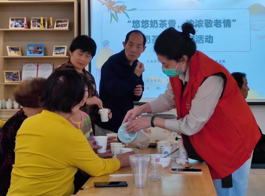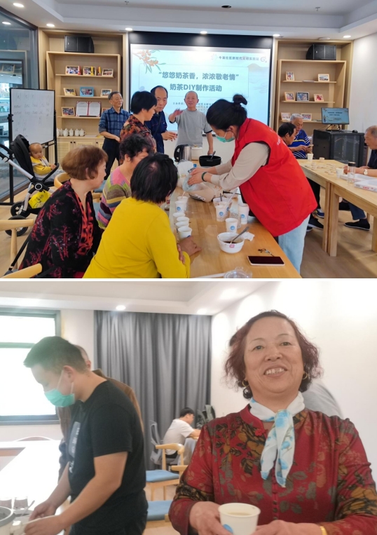 活動(dòng)現(xiàn)場(chǎng),工作人員將琳瑯滿目的飲品和水果、芋圓等制作飲品的食材,在保證衛(wèi)生和安全的前提下,擺放整齊并進(jìn)行分裝,方便居民們拿取。工作人員耐心講解奶茶的制作方法和步驟以及需要的材料,向各位老人示范怎么做奶茶。工作人員拿出做奶茶需要的食材及工具,按照比例在鍋里倒入水和茶,煮沸后再倒入一定比例的奶,不一會(huì)兒屋子里就飄起了奶茶的香味,喜歡喝甜的就多加入點(diǎn)糖。居民們依據(jù)自己的口味選擇材料,積極操作,盡情發(fā)揮自己的想象力和創(chuàng)造力,臉上洋溢著滿足的笑容。