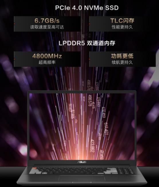 靈耀Pro16 2022搭載雙通道LPDDR5內(nèi)存,頻率高達(dá)4800MHz,且能效比更高,配合高性能NVMe PCIe 4.0固態(tài)硬盤,最高速度6.7GB/s,系統(tǒng)響應(yīng)更快,日常程序秒開,幾十G的大文件拷貝也不過轉(zhuǎn)眼工夫。采用TLC閃存顆粒,不僅性能更強(qiáng),使用壽命也更持久。