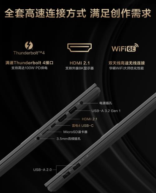 同時配備有雷電4 Type-C等多種常用接口,滿足日常創(chuàng)作、演示需求。其中功能最為強(qiáng)大的雷電4接口具有高達(dá)40Gbps的傳輸速度,能夠外接高性能顯卡塢、高速SSD、8K顯示器等,滿足各類擴(kuò)展需求。此外還可以進(jìn)行100W的PD快速充電,96Wh超大容量電池可配合華碩閃充功能,快速補(bǔ)充電量。