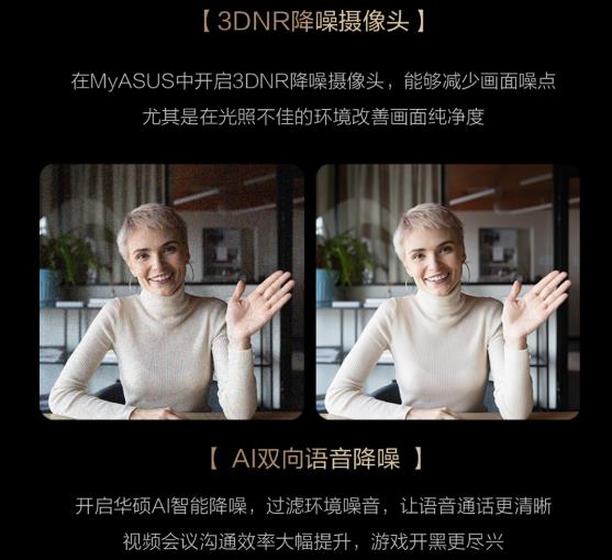 3DNR降噪攝像頭,大幅度提升光線不佳時的視頻畫面純凈度。陣列式AI降噪麥克風(fēng)使用MyASUS華碩管家中的AI降噪算法,進(jìn)行雙向AI語音降噪,讓通話時的人聲更清晰。