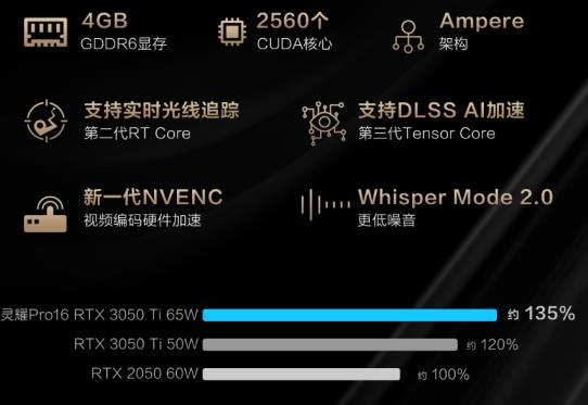顯卡方面,靈耀Pro16 2022搭載Nvidia GeForce RTX 3050Ti光追獨顯。全新Ampere架構(gòu),擁有2560個CUDA核心以及4GB GDDR6顯存。在DLSS AI加速和Dynamic Boost2.0顯卡智能動態(tài)增強(qiáng)技術(shù)的參與下,功耗可提升至65W,較RTX 2050提升74%的性能,讓這塊RTX 3050Ti成為一塊真正的“性能猛獸”,能夠輕松處理各種創(chuàng)作素材和動畫渲染。