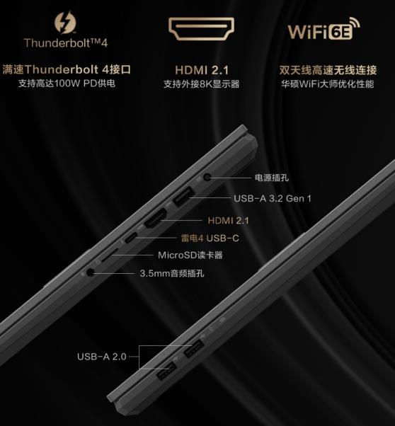 靈耀Pro16 2022配備有雷電4 Type-C等多種常用接口,拓展性全面,全接口的設(shè)計保證了創(chuàng)作者多端設(shè)備協(xié)作的需求。其中功能最為強(qiáng)大的雷電4接口具有高達(dá)40Gbps的傳輸速度,能夠外接高性能顯卡塢、高速SSD、8K顯示器等,滿足各類擴(kuò)展需求。